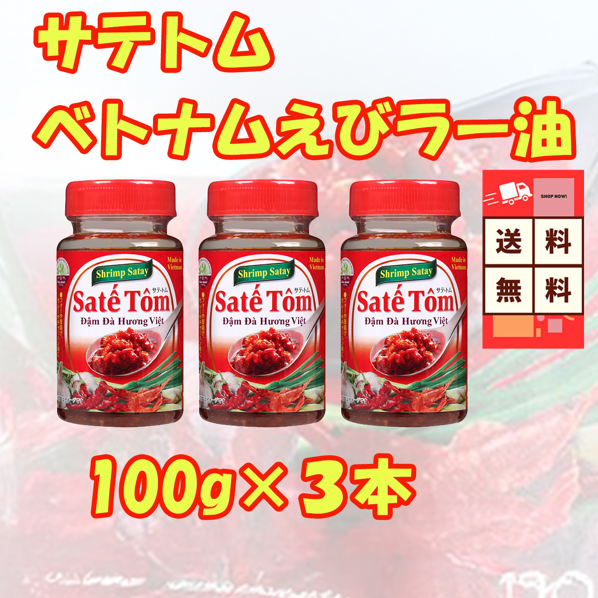 旨味×辛味のベストバランス!ベトナム発の大人気調味料「サテトム」がたっぷり使える3本セットで登場。香ばしいえびの風味に、ピリッとした唐辛子の辛さがやみつき!フォーやチャーハン、ラーメン、炒め物にちょい足しするだけで、本場のアジアンテイストが楽しめます♪100gのたっぷりサイズだから、毎日の料理に大活躍。辛いもの好きな方、いつもの料理にちょっと刺激が欲しい方にぴったりです。常備しておけば、食卓が一気にエスニックに!リピーター続出の万能えびラー油、ぜひお試しください。