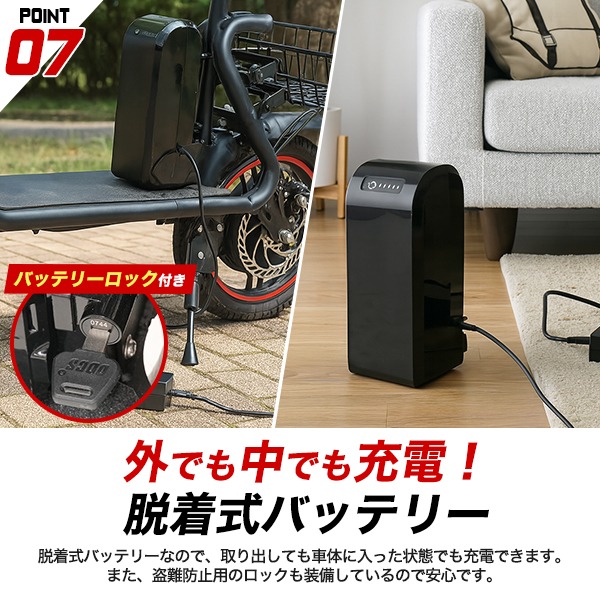 ■脱着式バッテリーで外でも中でも充電できる■パワフルな走行!400Wモーター搭載