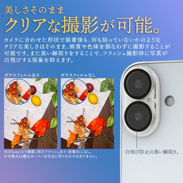 カメラに合わせた形状で、装着後も何も貼っていないかのようなクリアな美しさはそのまま、画質や色味を損なわずに撮影できます。
