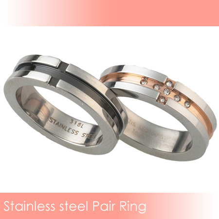 オリジナル刻印無料!洗練されたステンレス製の指輪、2点セットのペアリング。ブラックラインのメンズタイプと、キュービックジルコニア入りのピンクゴールドラインのレディースタイプをご用意致しました。ステンレスは傷つきにくく 酸化もしないので いつまでも輝きが損なわれず、ペアリングにぴったり。 金属アレルギーの方にも安心して お使いいただけますので 永く愛用して下さいね。