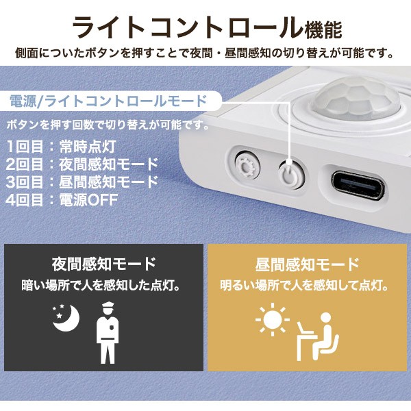 側面についたボタンで、夜間・昼間感知を切り替えできるライトコントロールモードを搭載。