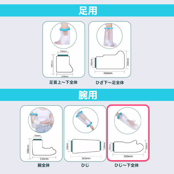 包帯・ギプスを装着したままお風呂に入ることができる密着シリコンタイプの防水カバーです。