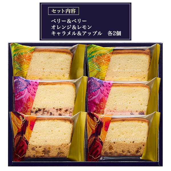 ベリー&ベリー、オレンジ&レモン、キャラメル&アップルの3種を各2個ずつ詰め合わせ。