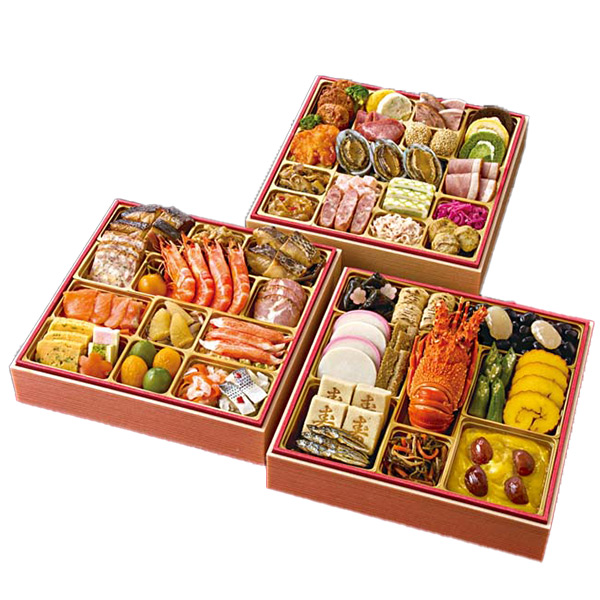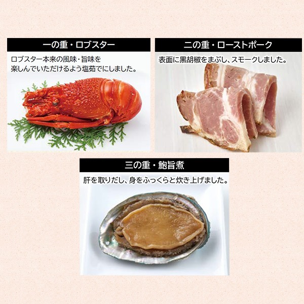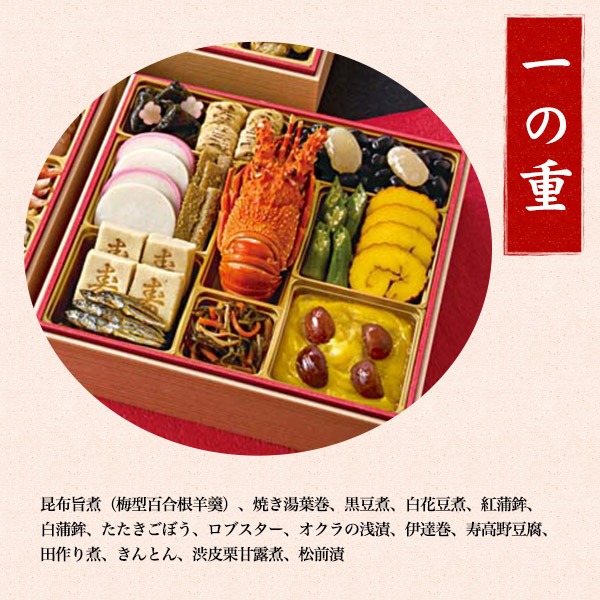 一の重は、ロブスターやきんとん等おせち料理の定番品、
