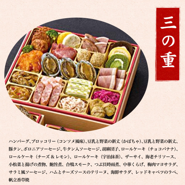 ぶり照焼、はすの芽(梅酢風味)、くるみ甘露煮、わかめ煮、真鯛幽庵焼、ミートローフ、葉付金柑甘露煮、有頭海老、ローストポーク、キャロットラペ、スモークサーモントラウト、ソデイカ昆布和え、数の子、大根焙煎胡麻サラダ、蟹風味蒲鉾土佐酢漬、九条葱入り玉子焼、博多高野(海老)、博多高野(ほうれん草)、梅型蒟蒻、若桃甘露煮、杏子煮、紅白なます、こはだレモン