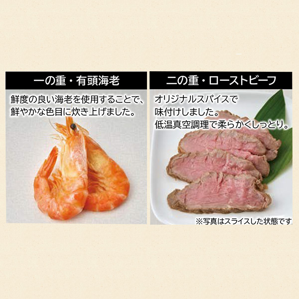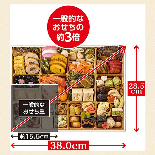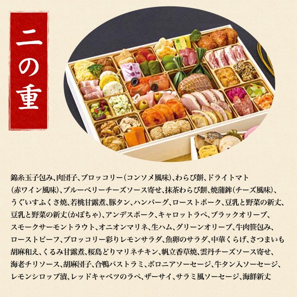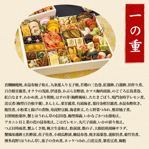 真鯛幽庵焼、糸昆布柚子和え、九条葱入り玉子焼、若鶏の三色巻、紅蒲鉾、白蒲鉾、田作り煮、百合根甘露煮、オクラの浅漬、伊達巻、かぶら甘酢漬、カマス梅肉南蛮、のどぐろ広島菜巻、紅白なます、わかめ煮、ぶり照焼、はすの芽(梅酢風味)、たたきごぼう、鳴門金時芋レモン煮、黒豆煮(梅型百合根羊羹)、きんとん、栗甘露煮、有頭海老、葉付金柑甘露煮、糸昆布酢炊き、鮑旨煮、小松菜と揚げの煮物、寿高野豆腐、海老新丈、たら野菜つみれ、椎茸柚子煮、貝照焼松葉串、蟹とほうれん草の信田巻、梅型蒟蒻、いかなごかつお節和え、アカニシ貝と菜の花の昆布和え、こはだレモン、丸穴子南蛮、いかの彩り和え、つぶ貝時雨煮、蟹ふくさ焼、帆立生姜和え、松前漬、数の子、大根焙煎胡麻サラダ、蟹風味蒲鉾土佐酢漬、真子旨煮、小胡瓜酢漬、鰊昆布巻、焼き湯葉巻、蓮根旨煮、姫竹旨煮、博多高野(ほうれん草)、茄子の含め煮、ホッケつみれ、白花豆煮、紫花豆煮、梅麩