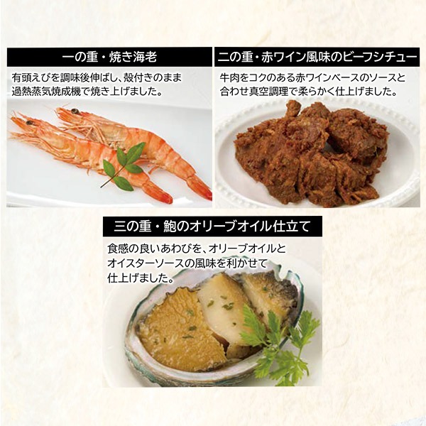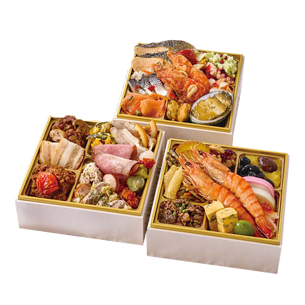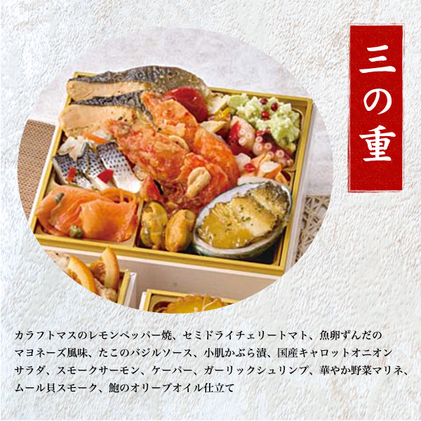三の重は、海鮮をテーマにした海の幸おせちが楽しめる三段おせちです。