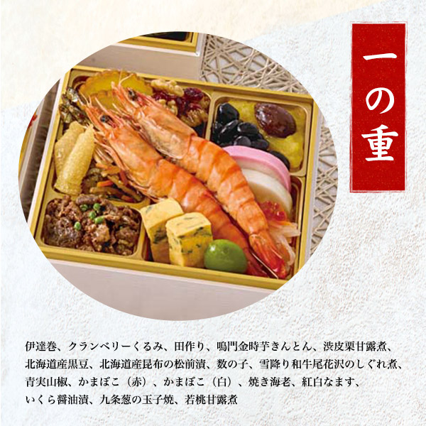 伊達巻、クランベリーくるみ、田作り、鳴門金時芋きんとん、渋皮栗甘露煮、北海道産黒豆、北海道産昆布の松前漬、数の子、雪降り和牛尾花沢のしぐれ煮、青実山椒、かまぼこ(赤)、かまぼこ(白)、焼き海老、紅白なます、いくら醤油漬、九条葱の玉子焼、若桃甘露煮