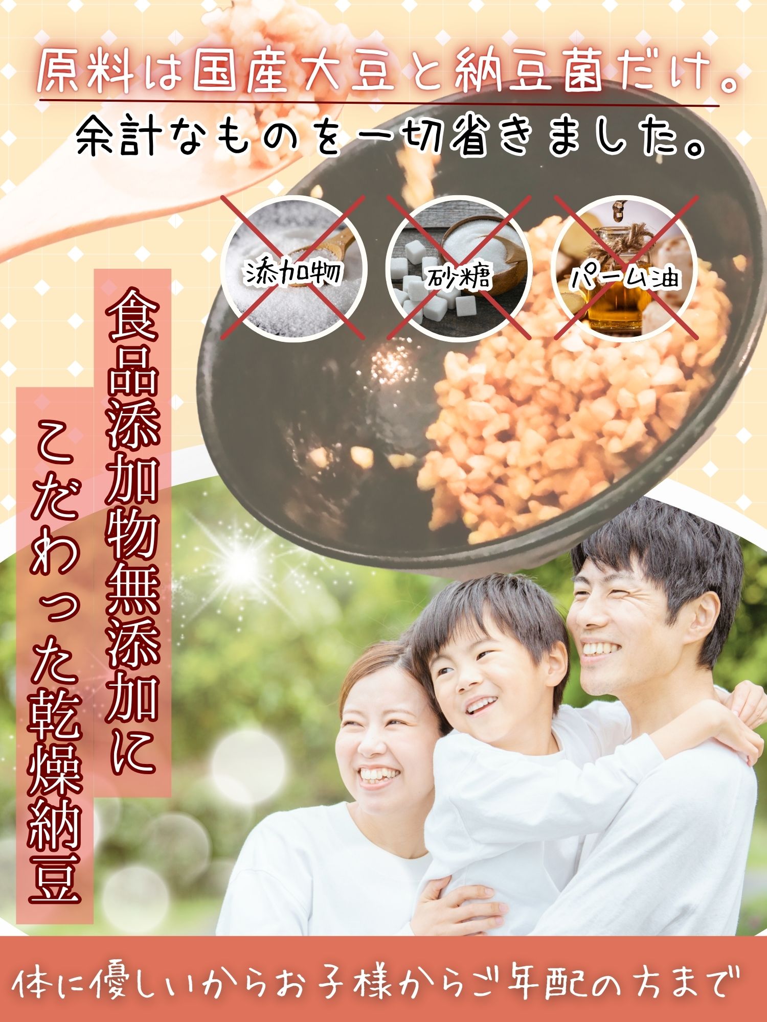 【 国産大豆100%使用・完全無添加 】遺伝子組換えでない国産丸大豆を厳選し、分別生産流通管理を徹底実施。化学調味料・食品添加物・砂糖・パーム油を一切使用しない完全無添加製法で、国産大豆と納豆菌のみで作られた素材そのままの純粋な乾燥納豆です。お子様の健康的なおやつとして最適な安全品質で、ワンちゃん、ネコちゃんのご飯やトッピングにも使用可能です。