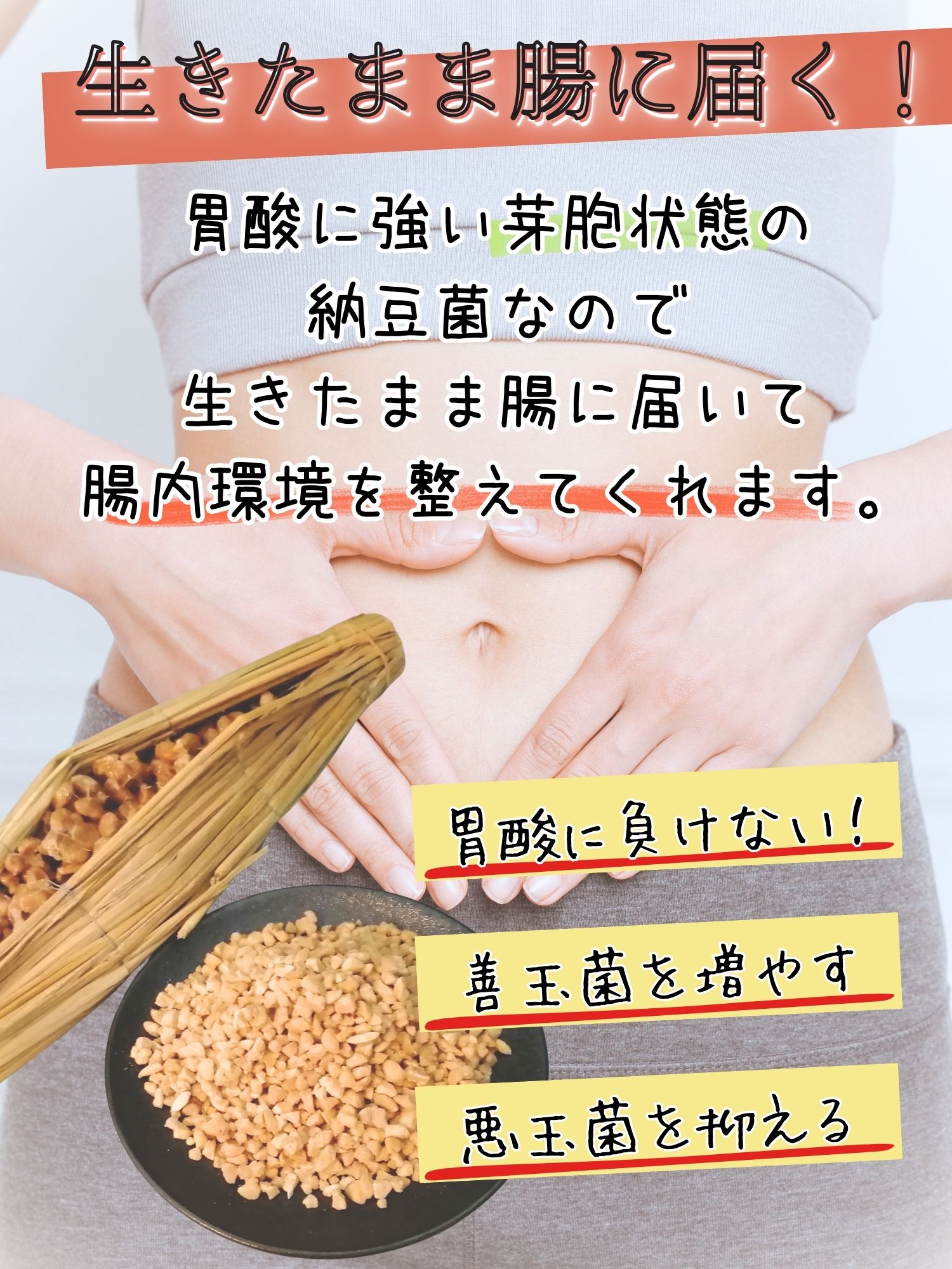 【 生きた納豆菌が腸まで届く発酵パワー 】フリーズドライ製法により納豆菌が生きたまま腸内に到達する発酵パワーを実現。胃酸に強い納豆菌が腸までしっかり届いて効果を発揮し、善玉菌を増やし悪玉菌を排除して腸内環境を整える腸活サポートをします。お腹からキレイを意識したい方の間食として理想的で、発酵食品の力で毎日の健康習慣をサポートします。