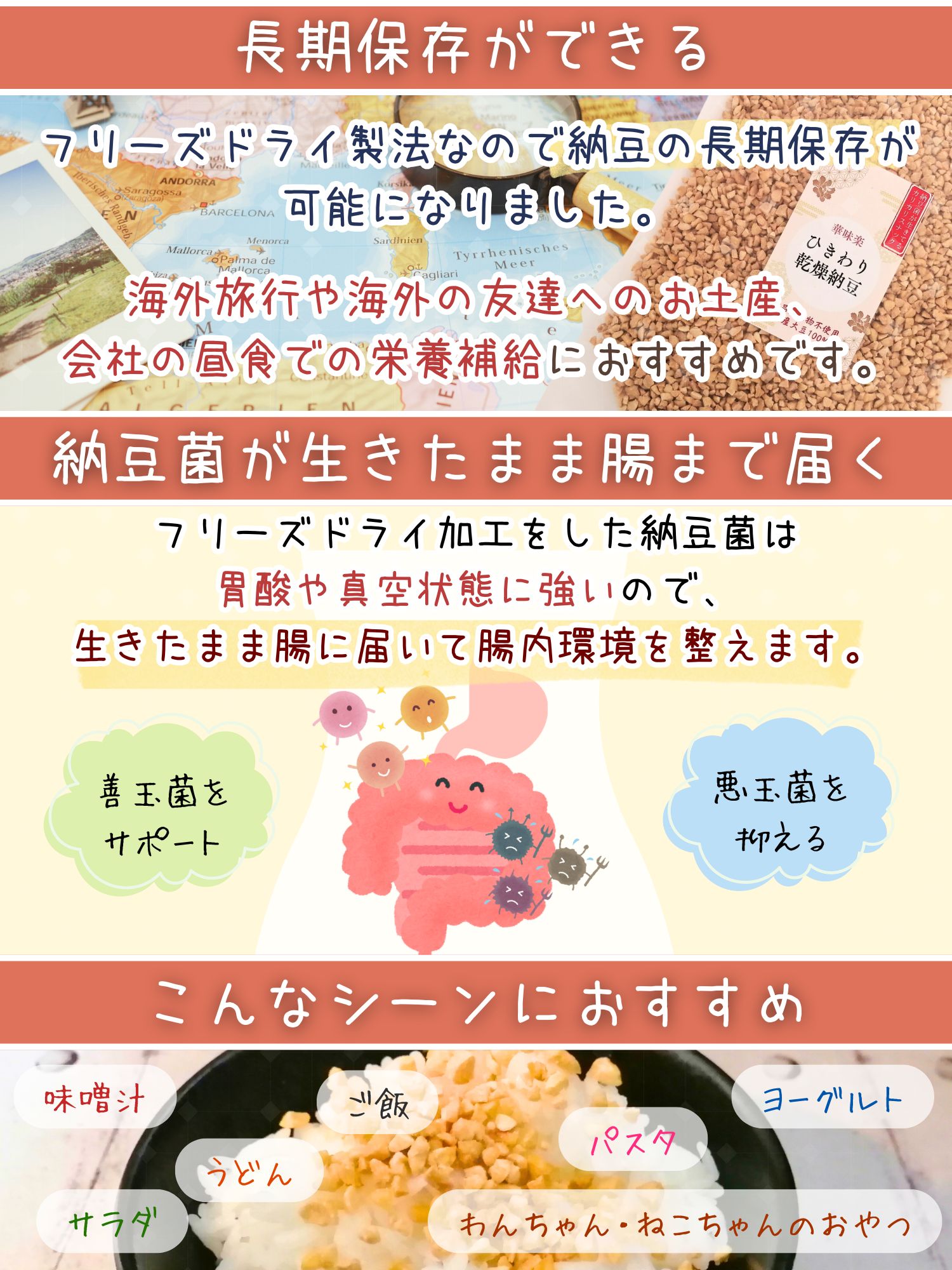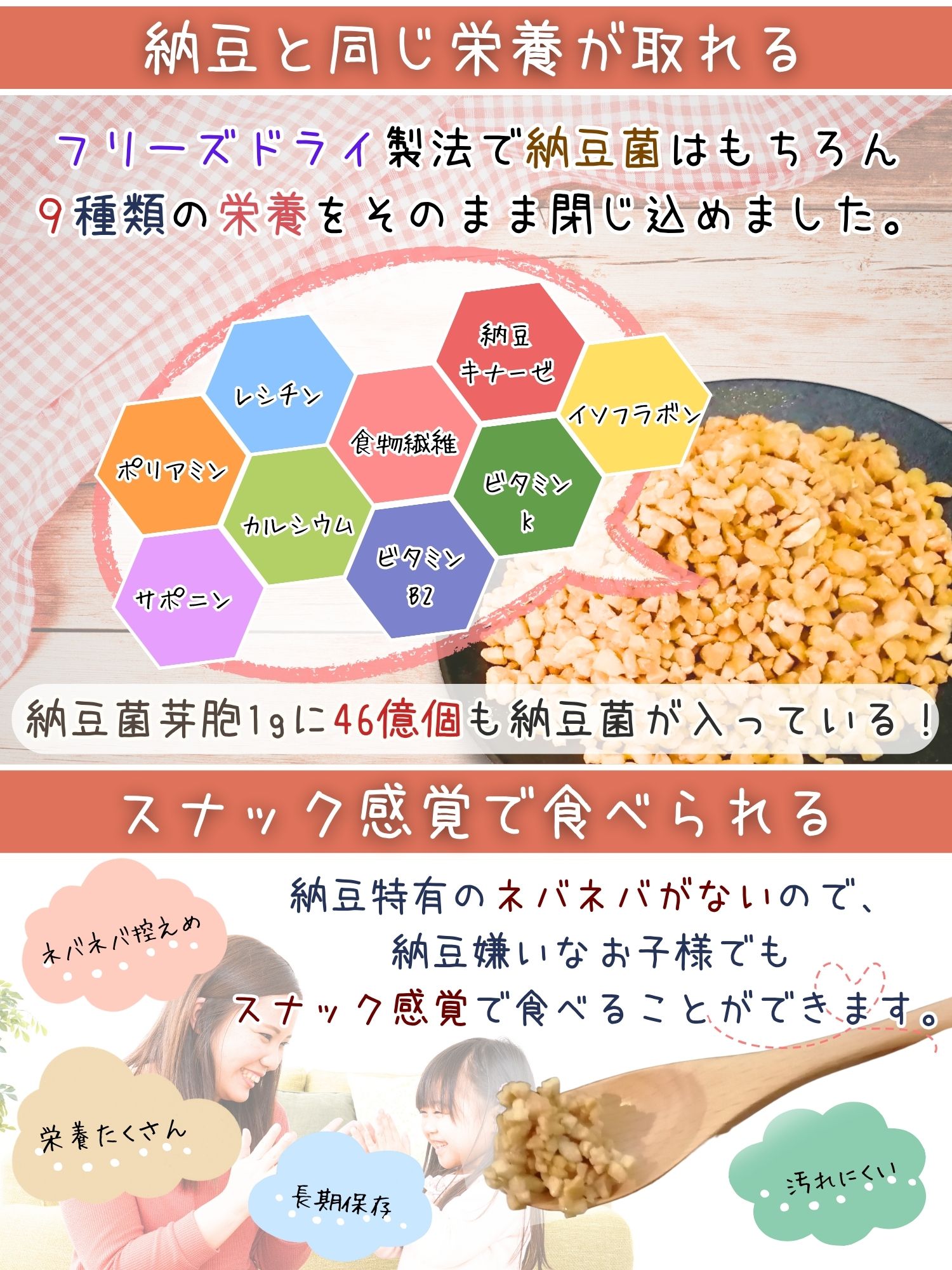 【 フリーズドライ製法で栄養と風味を凝縮 】フリーズドライ製法により納豆の風味と栄養素を損なわずギュッと凝縮。新鮮な国産大豆の美味しさと栄養をそのまま閉じ込め、加熱処理と異なり栄養成分の破壊を最小限に抑える製法です。健康志向の方にこそ選ばれる高品質な製造方法で、旨味が濃い仕上がりで満足度の高い味わいを実現しています。