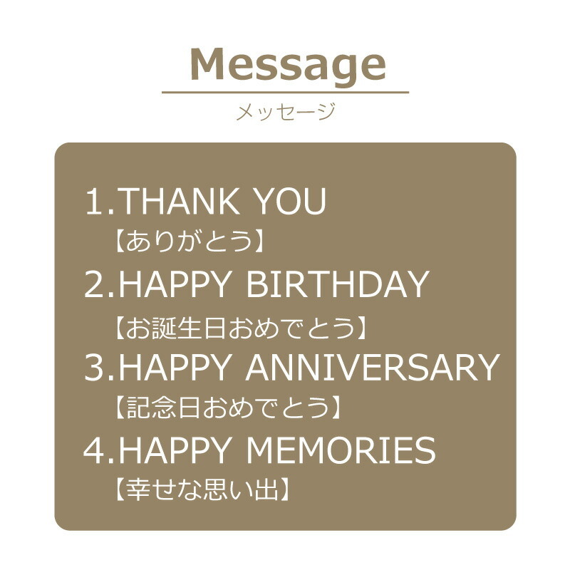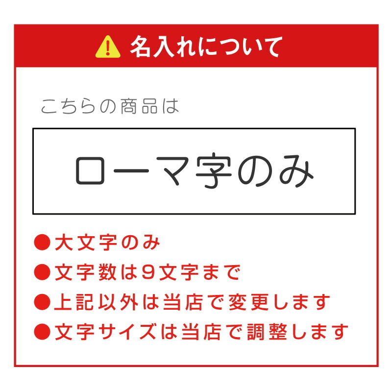 | 【 表記 】 : 大文字のみ / 【 文字数 】 : 9文字まで ・上記以外は当店で変更します。 ・文字サイズは当店にて調整いたします。 ※名入れ・メッセージを彫刻しない場合、プレートは付きません 。 |