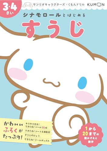 シナモロールと一緒にすうじのおべんきょうをはじめよう! シナモロールト仲間たちがページいっぱいに登場して学習を応援してくれる、すうじに興味をもちはじめた3・4歳のお子さまにぴったりのドリル。 ★シナモロールのイラストで楽しむ運筆練習や、数字の読み書き、めいろなどのワークに取り組みながら、20までの数字を学習できます。 ★幼児向けドリル教材のパイオニア、「くもんの幼児ドリル」のノウハウを活用しているから、学びやすさ、身につきやすさもバッチリです。 ★キラキラできたねシール、表彰状、 すうじの表、ミニ紙工作と、かわいいふろくがたっぷり!