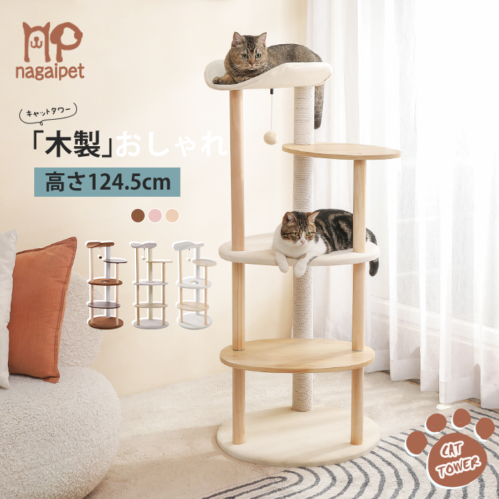 送料無料 キャットタワー 木製 木目調猫タワー 据え置き おしゃれ 爪とぎポール ネコ 猫用 多頭飼い 上りやすい 安定性抜群 小型猫 大型猫 高さ124.5cm