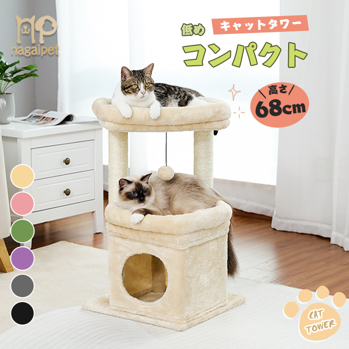 送料無料 キャットタワー 小型 据え置き型 猫タワー 猫ハウス 爪とぎポール 台座 頑丈 おしゃれ シニア ねこ 仔猫 上りやすい 安定性抜群 高さ68cm