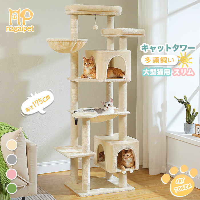 【12/26日発送】キャットタワー スリム 大型猫用 多頭飼い 猫タワー 据え置き型 コンパクト 省スペース ハンモック サボテン 爪研ぎ 人気 おしゃれ 高さ175cm