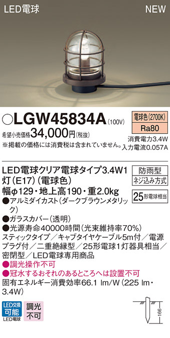 LGW45834A パナソニック LED電球アプローチスタンド(3.4W、電球色)
