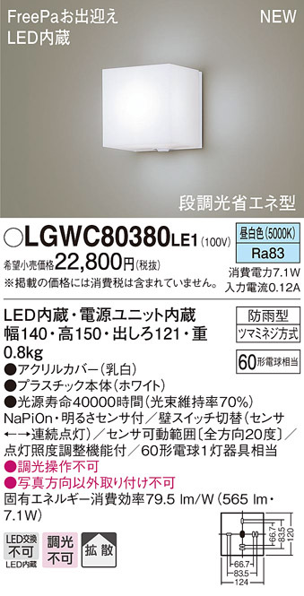 LGWC80380LE1 パナソニック 人感センサー付 LEDポーチライト 昼白色
