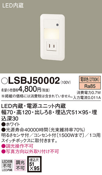 LSBJ50002 パナソニック LEDフットライト コンセント付(LSシリーズ、0.7W、電球色、2700K)【LBJ70076同等品】