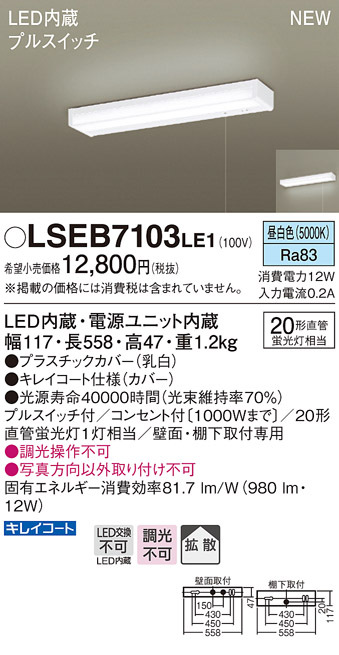 LSEB7103LE1 パナソニック LEDキッチンライト[プルスイッチ付](LSシリーズ、12W、昼白色)【LGB52095LE1同等品】【メーカー生産待ちのため納期未定】