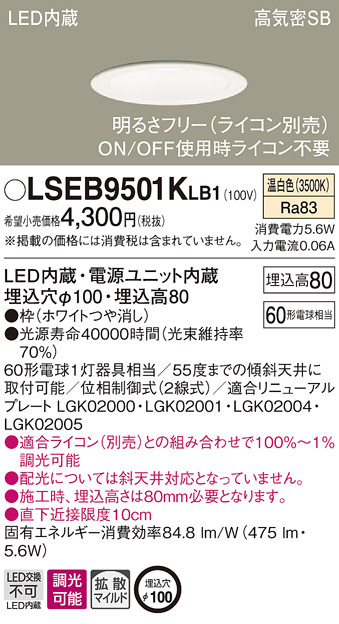 LSEB9501KLB1 パナソニック 高気密SB形 LEDダウンライト LSシリーズ φ100 調光 拡散 温白色【LGD1100VLB1同等品】