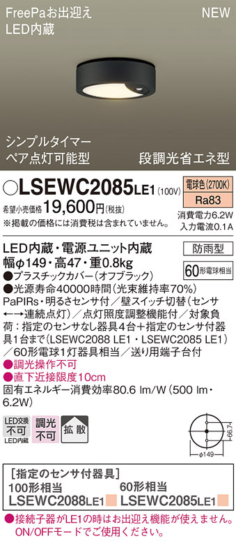 LSEWC2085LE1 パナソニック 人感センサー付 軒下用LEDシーリングライト FreePaお出迎え ペア点灯可能型 拡散 電球色