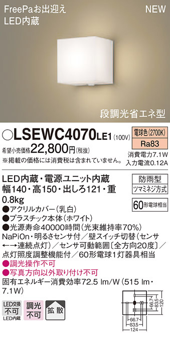 LSEWC4070LE1 パナソニック 人感センサー付LEDポーチライト LSシリーズ 電球色【LGWC80360LE1同等品】