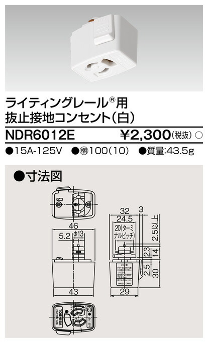 NDR6012E 東芝 接地極付抜止コンセントプラグ(白)