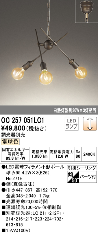 OC257051LC1 オーデリック LEDシャンデリア[調光型](12.6W、電球色)