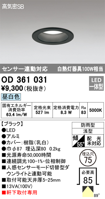 【掘り出しモノ】OD361031 オーデリック 軒下用LEDダウンライト φ75 昼白色【他店舗併売品】