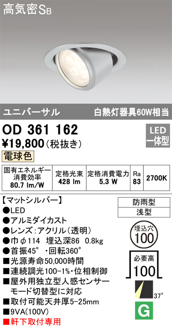 【掘り出しモノ】OD361162 オーデリック 軒下用LEDユニバーサルダウンライト φ100 電球色【他店舗併売品】