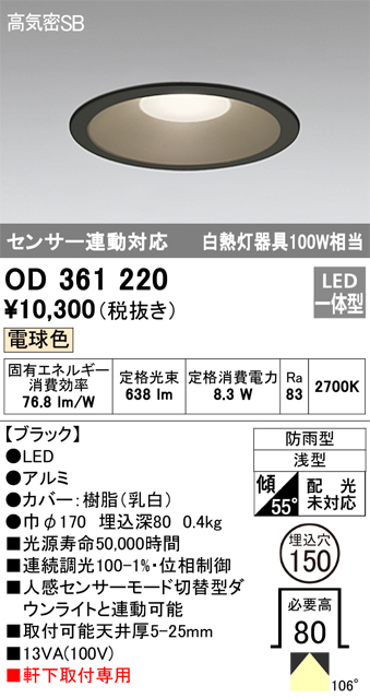【掘り出しモノ】OD361220 オーデリック 軒下用LEDダウンライト φ150 電球色【他店舗併売品】