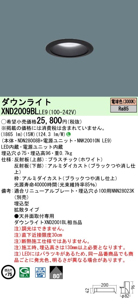 XND2009BLLE9 パナソニック LEDダウンライト ワンコア・一般タイプ[LED200形](φ75、一般光色、拡散、電球色)