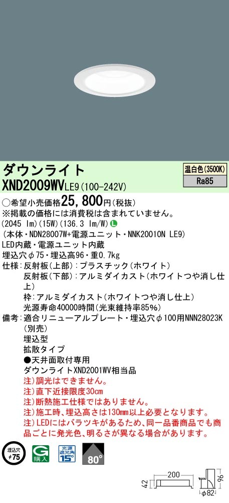 XND2009WVLE9 パナソニック LEDダウンライト φ75 拡散 温白色