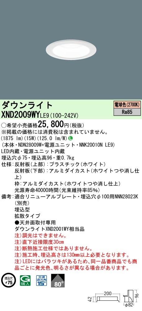 XND2009WYLE9 パナソニック LEDダウンライト φ75 拡散 電球色2700K