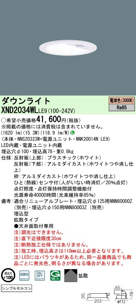 XND2034WLLE9 パナソニック 人感センサー付LEDダウンライト φ100 拡散 電球色