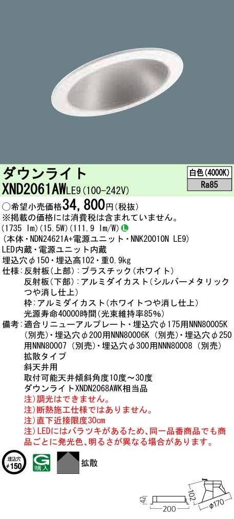 XND2061AWLE9 パナソニック 傾斜天井用LEDダウンライト φ150 白色