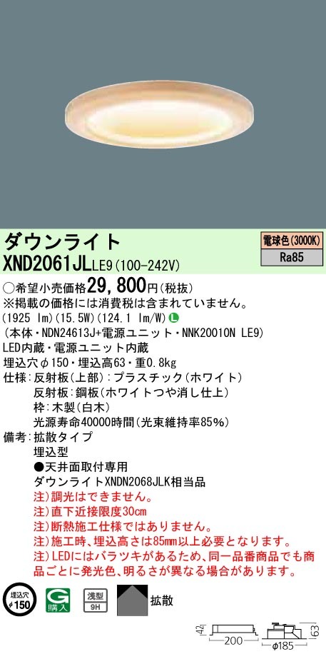 XND2061JLLE9 パナソニック 和風LEDダウンライト[LED200形](一般光色、φ150、15.5W、拡散タイプ、電球色)