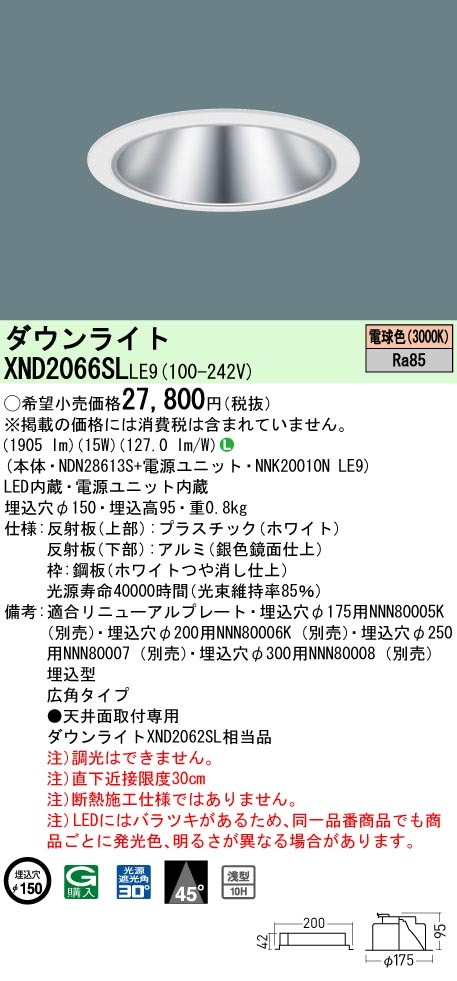 XND2066SLLE9 パナソニック LEDダウンライト ワンコア・コンフォートタイプ[LED200形](φ150、一般光色、広角、電球色)