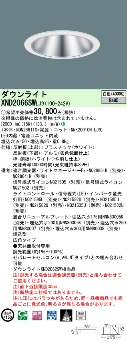 XND2066SWLJ9 パナソニック LEDダウンライト φ150 調光 広角 白色