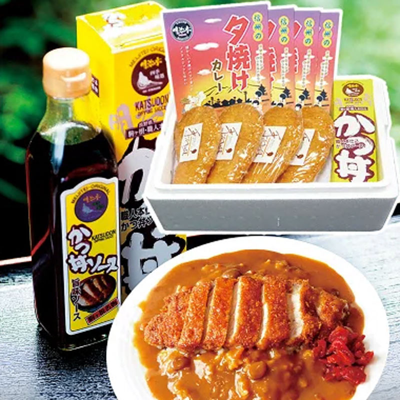 信州産豚ロース(約120g)、明治亭オリジナルカレー(×4)、明治亭オリジナルかつ丼用ソース(300g×1)