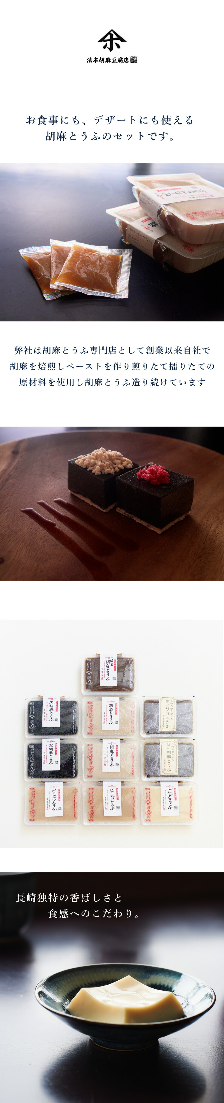 | 内容量 | 各220g胡麻たれ15g(長崎の昔ながらの甘い胡麻とうふには胡麻たれはついておりません。 |