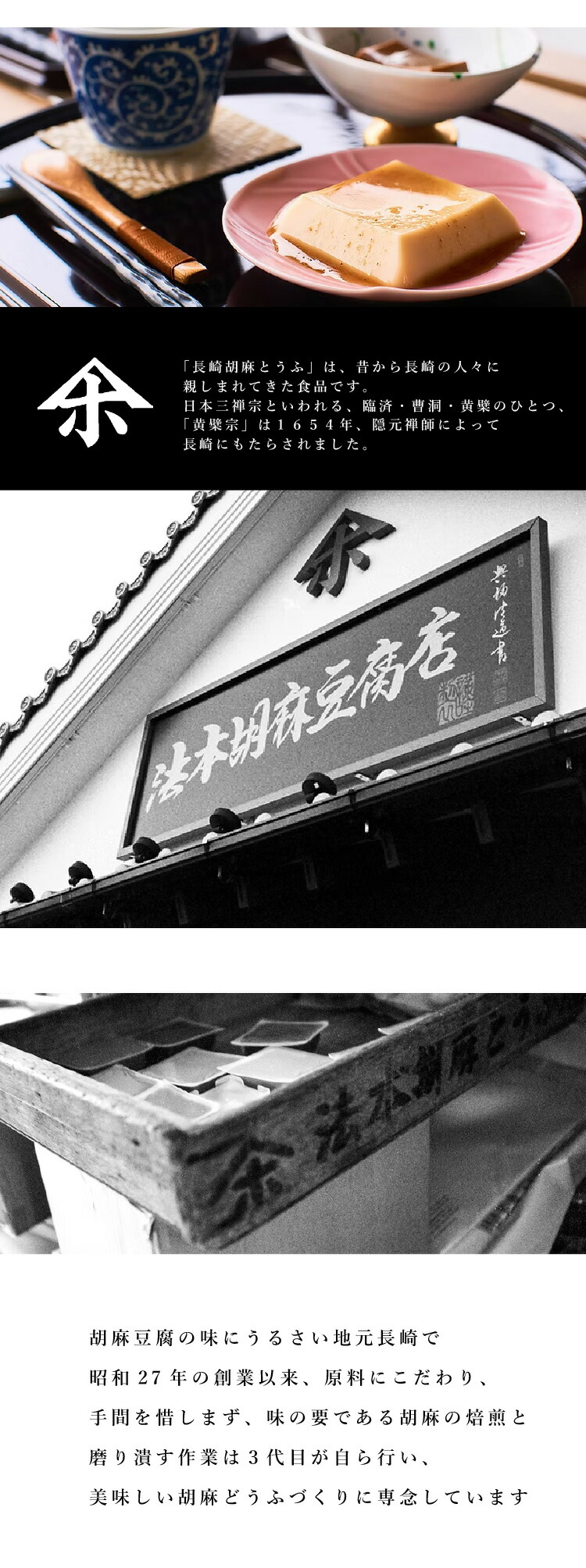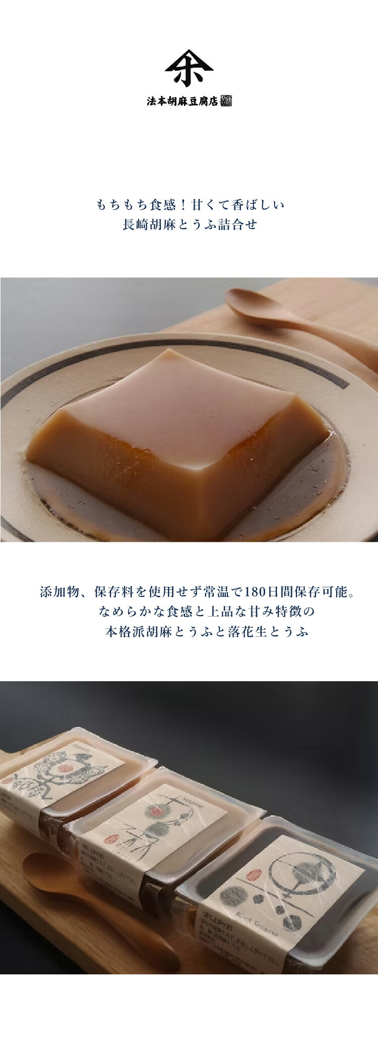 | 商品説明 | 添加物、保存料を使用せず常温で180日間保存可能。胡麻を自社で浅く焙煎する事で胡麻本来の香りを引き立たせそれをペーストにし、落花生とうふは甘くて香ばしく乳化剤等の添加物は使用せず100%ピーナッツを使用しました。それぞれを鹿児島・喜界島の粗糖と長崎・五島列島の天日塩を使用して丁寧に練り上げた。なめらかな食感と上品な甘み特徴の本格派胡麻とうふと落花生とうふ |