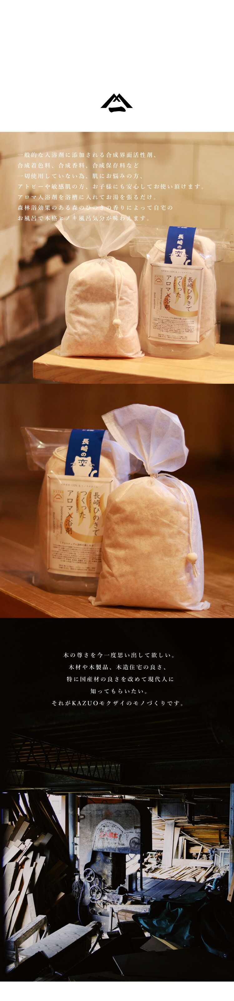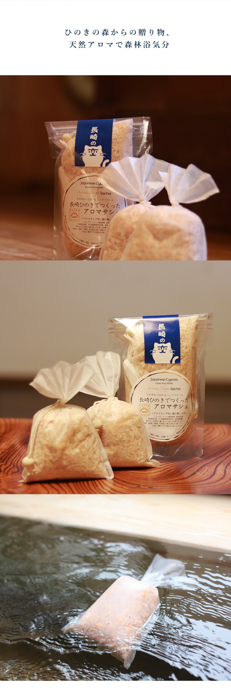 おがくず状に加工した長崎県産ひのきを主原料とし、細かく砕いたひのきのウッドチップやヒノキチオールと組み合わせ不織布に詰めた天然アロマ商品です。 天然のアロマの香りに癒されプチ森林浴を楽しめます。扱い易いサシェ(匂い袋)のアロマサシェと大袋お風呂用のアロマ入浴剤の詰め合わせセットです。