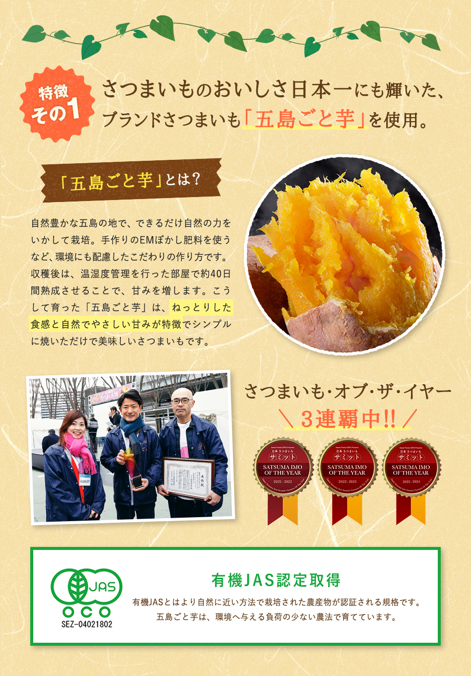 ※ごと芋は有機JASマーク認定商品です。有機JASとはより自然に近い方法で栽培された農産物が認証される規格です。