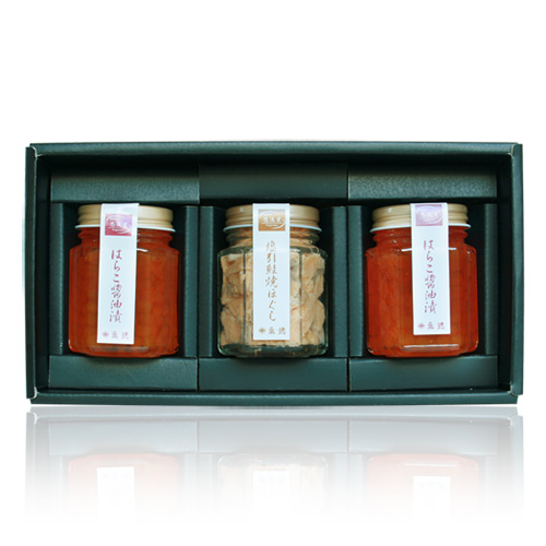 いくらの呼称で古くから食材としてきた「はらこ」の醤油漬と、冬の寒風に晒してつくられる「塩引鮭」の焼ほぐしを詰合せにしました。