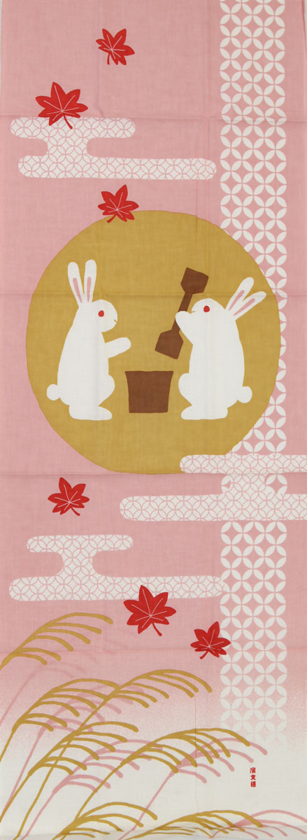 濱文様の秋の絵手拭い。明るい夜は餅つきうさぎも楽しそう。