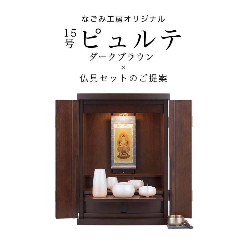 | 国産ミニ仏壇 15号ピュルテ ダークブラウン ・ やわらぎ五具足 ・ おりん鳳雲1.8寸 ・ おりんステージ ・ 掛け軸きよみず豆代本尊のみ ・ 掛け軸スタンドセット | |