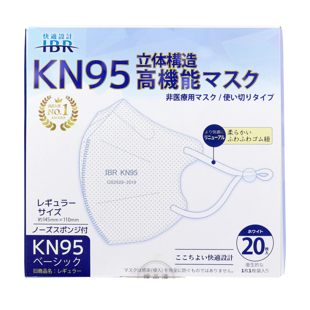 KN95 ベーシック 立体構造 高機能マスク ホワイト レギュラーサイズ 個別包装 20枚入り X3箱
