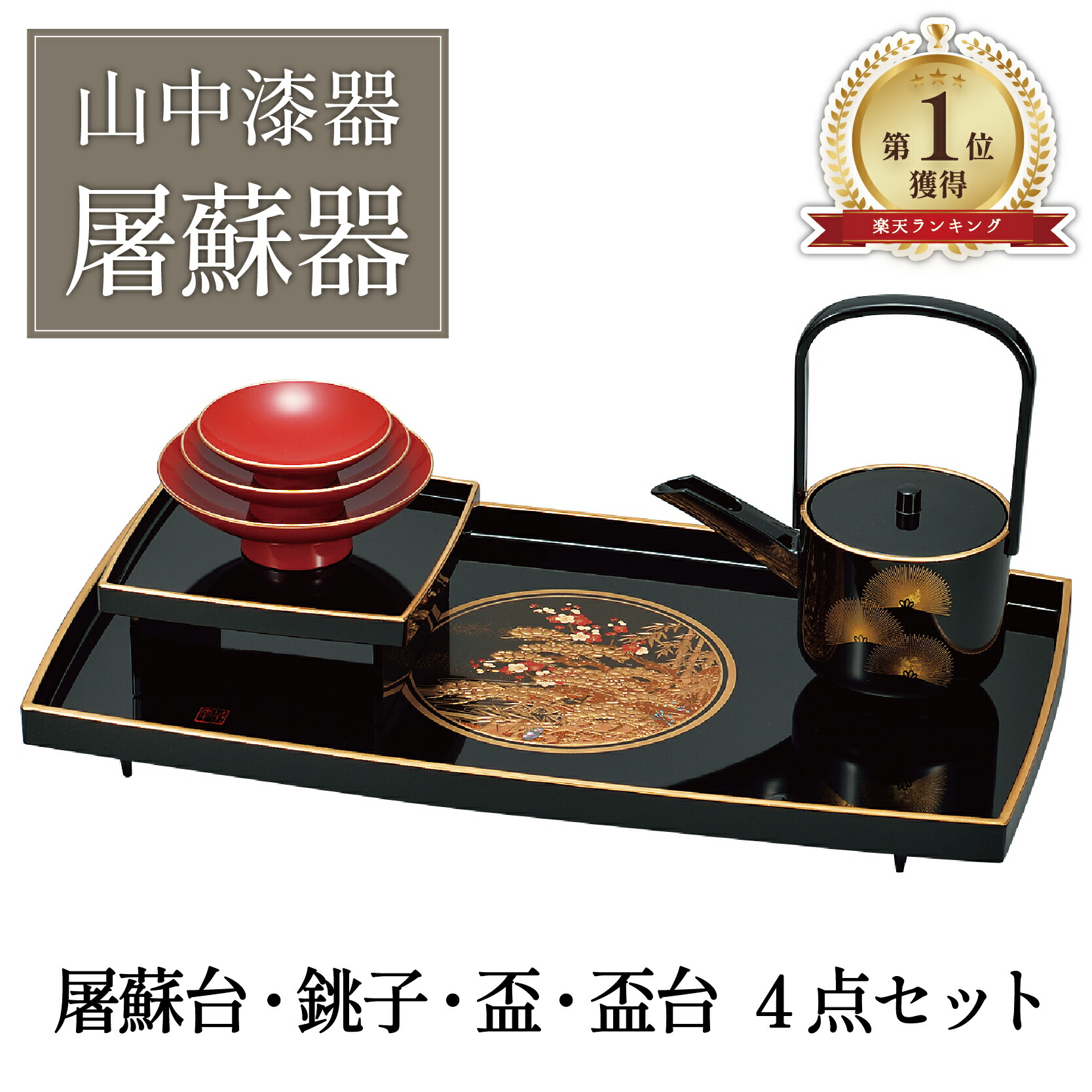 盛り蒔絵という技法で、立体的に表現された松竹梅の絵柄が、豪華で美しい屠蘇器です。松竹梅は、慶事・吉祥のシンボルとして縁起の良いとされておりますので、お正月の華やかな席に最適です。